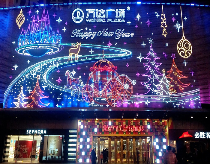 商場外墻搭配商場外面的空間同進行亮化處理,效果可能會更好,當(dāng)然這是建立在商場外面具有足夠的空間的前提下。例如商場的廣場上搭配使用具有節(jié)日氣息的燈光造型,使商場節(jié)日氛圍更加濃烈,從而為顧客營造一種更加舒適、歡快的購物氛圍。