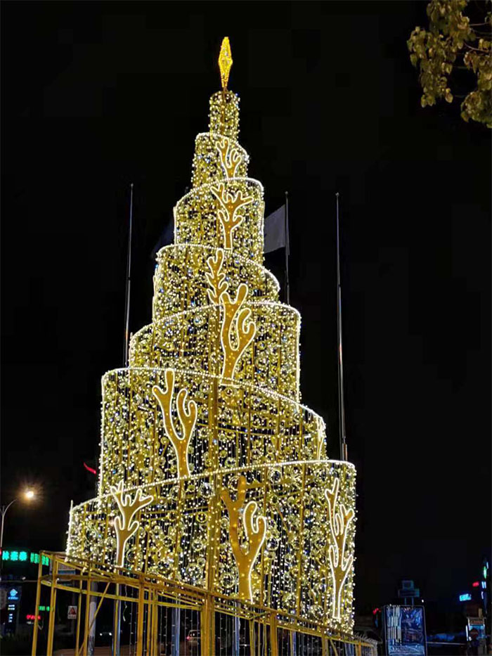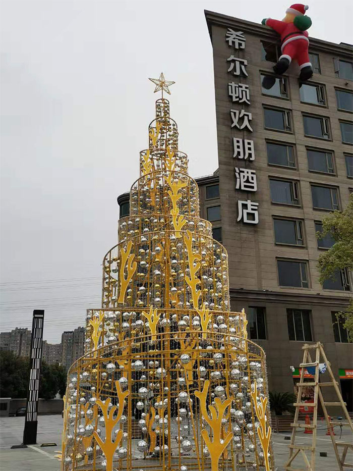 安裝之前天公不作美,天空飄起小雨,為了不耽誤使用,龍君的安裝師傅在雨停后立即進(jìn)行圣誕樹(shù)的組裝,并沒(méi)有因?yàn)樘鞖庠蛳胍s工快速完工而草草了事,每一根燈串,每一層骨架,每一顆固定螺絲,都認(rèn)真仔細(xì)地進(jìn)行安裝。圣誕樹(shù)就安裝在酒店門口,夜幕降臨,點(diǎn)亮圣誕樹(shù),就像點(diǎn)亮了整個(gè)黑夜。