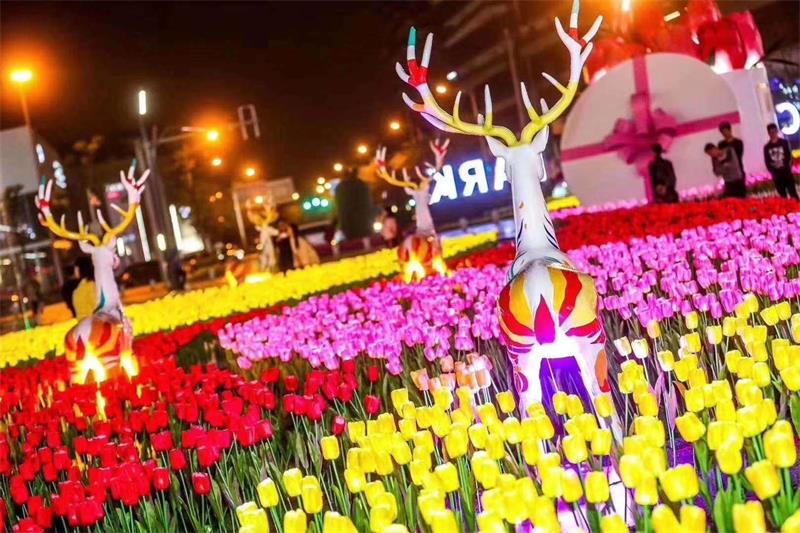 4、郁金香燈海—郁金香五顏六色,紅的、黃的、粉的,每種不同的顏色代表不同的祝福,郁金香插地?zé)舸蛟斓臒艄夂Q笫潜容^常見的場景,因為它的顏色相對來說比較艷麗,顏色可穿插使用。