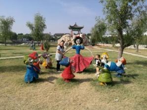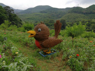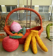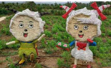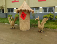稻草人雕塑簡而言之就是用傳統(tǒng)的稻谷秸稈編制而成的新型工藝品。產(chǎn)品主要材料為稻草繩,稻草單頭席,稻草雙頭席,麻繩,防腐鋼材制作而成。制作流程為:確定圖案;選購材料;焊接骨架;編扎草簾草繩;噴繪最后運(yùn)輸安裝。